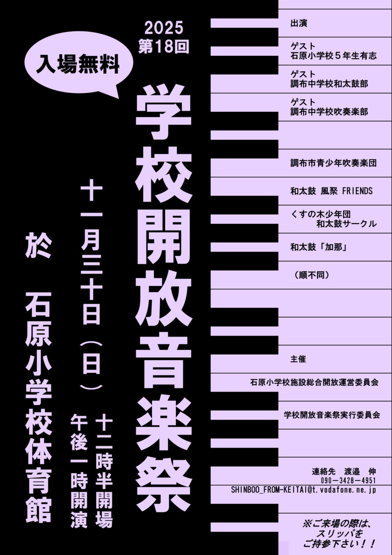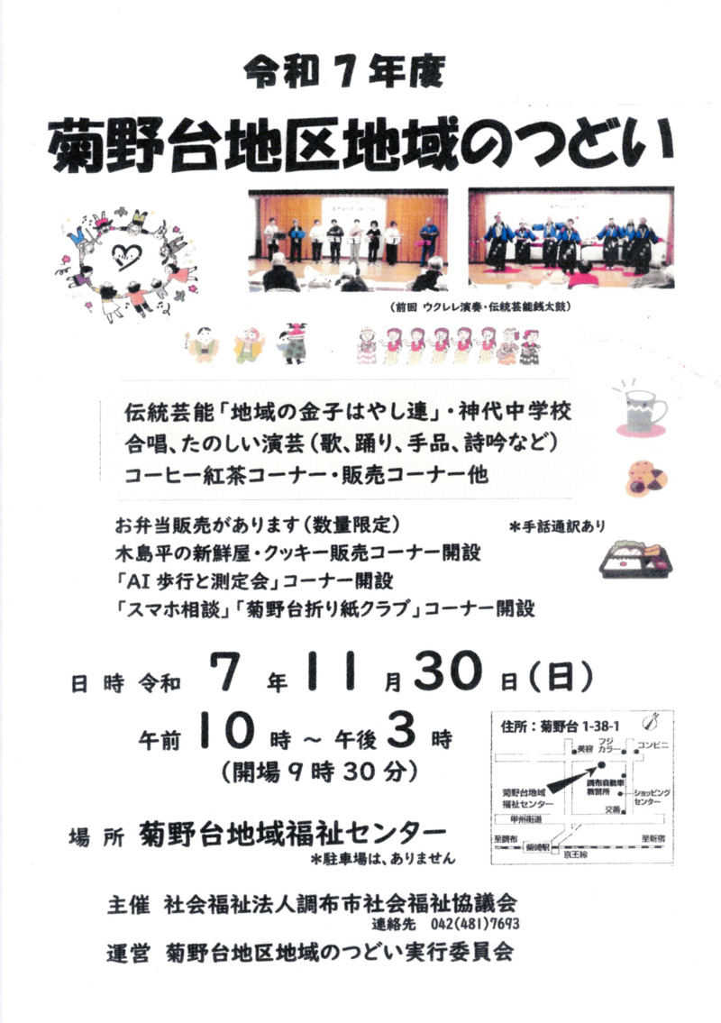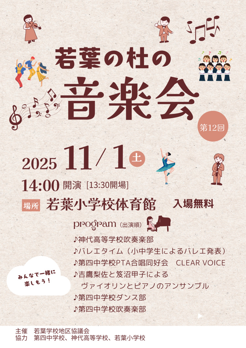 本サイトのイベント情報は主催団体が提供したものです。 詳細や開催状況については、直接該当団体にお問い合わせください。 団体と参加者間でのトラブルや紛争について、当サイト(運営者)は一切の責任を負いかねます。 参加者の皆様はご自身で十分に確認の上、ご参加ください。 何卒ご理解とご協力を賜りますようお願い申し上げます。 小学校区を選ぶ 第一小学校区 第二小学校区 第三小学校区 八雲台小学校区 富士見台小学校区 滝坂小学校区 深大寺小学校区 上ノ原小学校区 石原小学校区 若葉小学校区 緑ヶ丘小学校区 染地小学校区 北ノ台小学校区 多摩川小学校区 杉森小学校区 飛田給小学校区 柏野小学校区 国領小学校区 布田小学校区 調和小学校区 菊野台地区地域のつどい 小学校区 第二小/八雲台小/滝坂小/深大寺小/上ノ原小/若葉小/柏野小/国領小/調和小 合同防犯パトロール実施のお知らせ 小学校区 第一小/第三小/石原小 性と生き方の多様性講座 11月の講座 小学校区 第一小/第二小/第三小/八雲台小/富士見台小/滝坂小/深大寺小/上ノ原小/石原小/若葉小/緑ヶ丘小/染地小/北ノ台小/多摩川小/杉森小/飛田給小/柏野小/国領小/布田小/調和小 若葉の杜の音楽会 小学校区 若葉小 調布フィルハーモニー管弦楽団演奏会 小学校区 第一小/第二小/第三小/八雲台小/富士見台小/滝坂小/深大寺小/上ノ原小/石原小/若葉小/緑ヶ丘小/染地小/北ノ台小/多摩川小/杉森小/飛田給小/柏野小/国領小/布田小/調和小 ハワイアンフラフェスティバル 小学校区 第一小/第二小/第三小/八雲台小/富士見台小/滝坂小/深大寺小/上ノ原小/石原小/若葉小/緑ヶ丘小/染地小/北ノ台小/多摩川小/杉森小/飛田給小/柏野小/国領小/布田小/調和小 ハミングバードリコ40周年記念コンサート 小学校区 第一小/第二小/第三小/八雲台小/富士見台小/滝坂小/深大寺小/上ノ原小/石原小/若葉小/緑ヶ丘小/染地小/北ノ台小/多摩川小/杉森小/飛田給小/柏野小/国領小/布田小/調和小 調布シニアアンサンブル花音2025演奏会 小学校区 第一小/第二小/第三小/八雲台小/富士見台小/滝坂小/深大寺小/上ノ原小/石原小/若葉小/緑ヶ丘小/染地小/北ノ台小/多摩川小/杉森小/飛田給小/柏野小/国領小/布田小/調和小 2025第18回学校開放音楽祭 小学校区 石原小 西部飛田給自治会主催ハロウィンイベント 小学校区 飛田給小 もっと見る