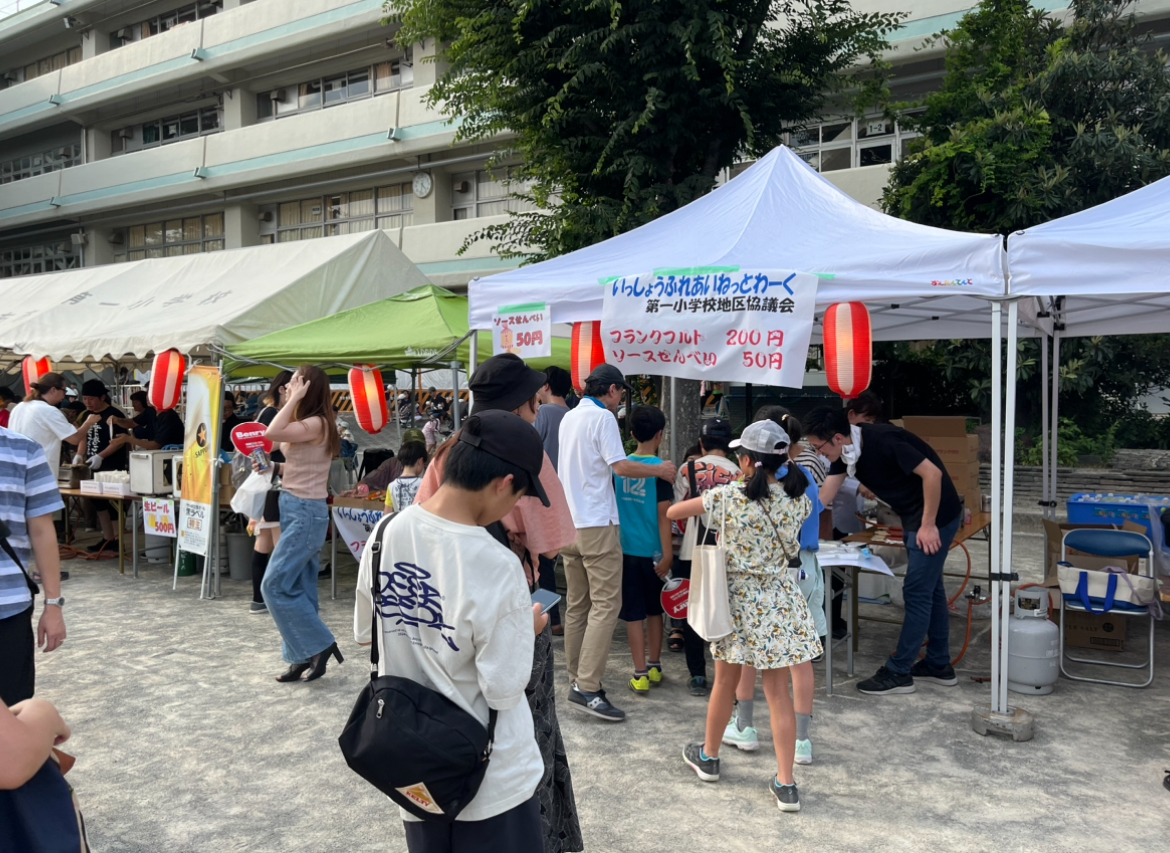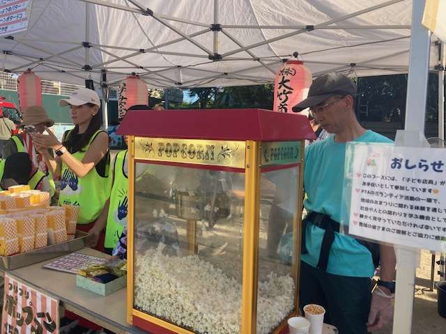 地区協議会の屋台でポップコーン,ウインナー,飲み物の販売をお手伝いさせてもらいました。ポップコーンの機械に子どもも大人も興味津々!みんな思い思いのフレーバーを選んで楽しそうにお店を後にしていました。ラムネが人気すぎて買えなかった子たちがいたのが残念でした。