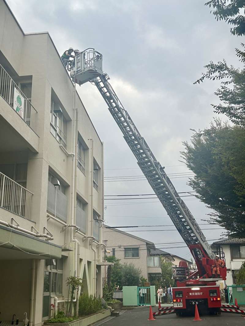 最後には調布消防署と調布市消防団第2分団による合同演技として、一斉放水と、屋上に逃げ遅れた要救助者の、はしご車を使った救出救助活動が行われ、参加者は大盛り上がり!