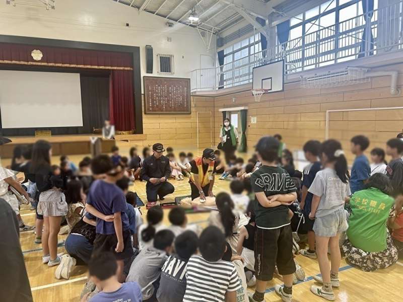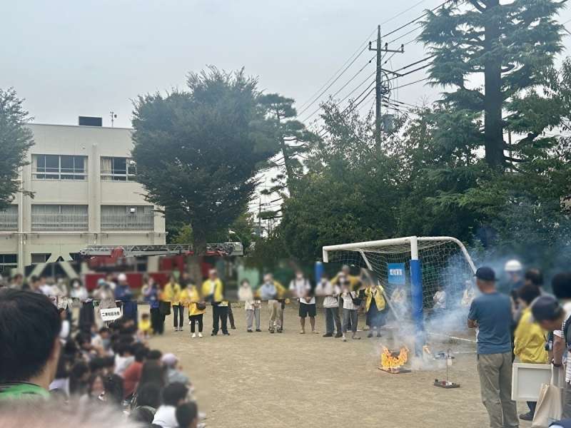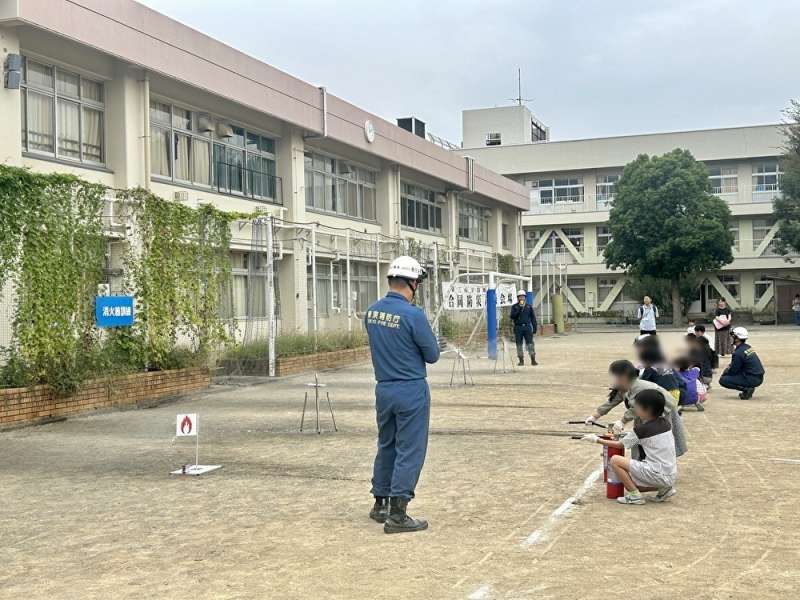 全体訓練では、1・2年生が初期消火訓練、3・4年生が応急救護訓練、5・6年生と保護者、地域住民が燃焼実験に参加しました。