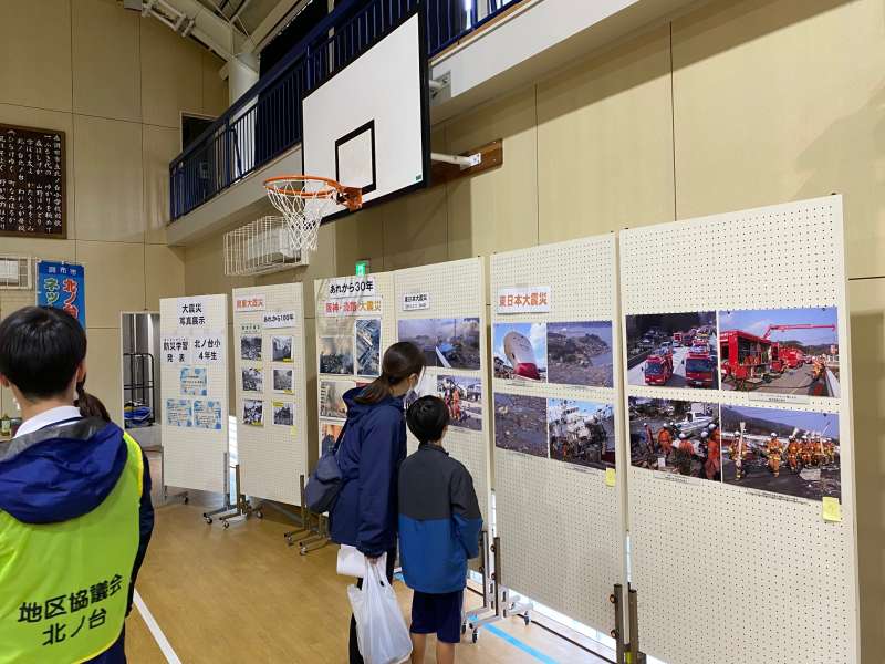 また,体育館の一部には,過去に起きた大震災の被害状況が鮮明に分かる写真を展示している震災写真展示コーナーや,北ノ台小学校4年生の防災学習映像がスクリーンに放映され,多くの方が見に来られていました。