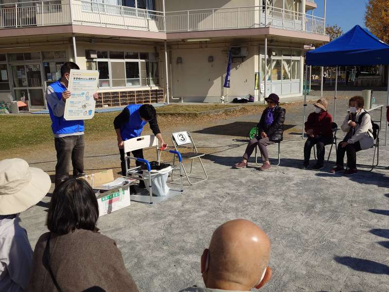 当日は約150人もの方に参加いただき、4つのグループに分かれて、「消火訓練、煙体験、AED訓練」を体験するとともに、総合防災安全課職員と初動要員職員から非常時のトイレの使用方法についての説明を受けました。