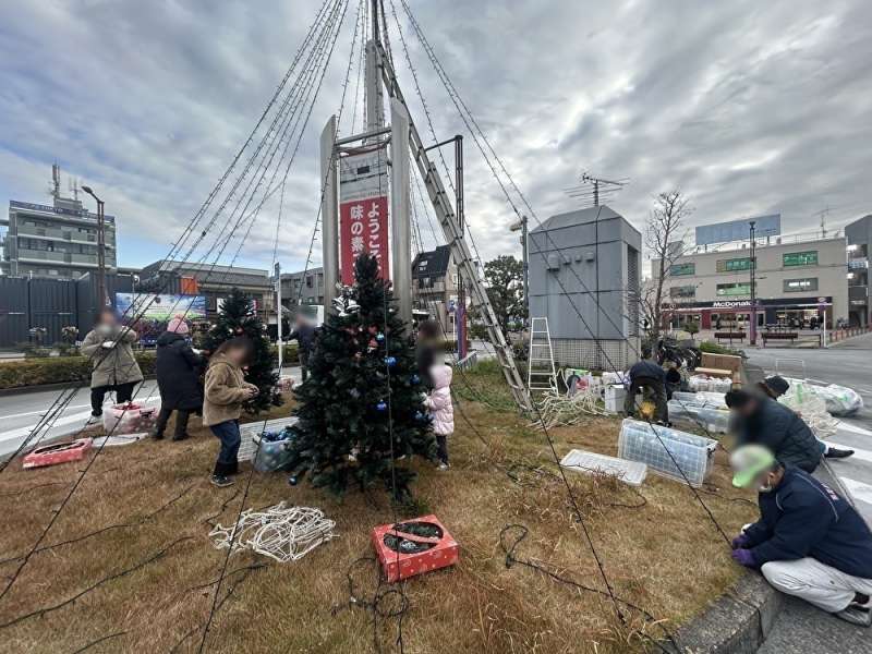 朝8時から地域の方々が集まり、飛田給駅北口広場でイルミネーションの飾付に取り掛かりました。地上3mほどの高所の飾付まで、全て地域の方々の手作業で準備が進められます。ご家族で参加してくださる方もいらっしゃり、子どもたちはキラキラのオーナメントに興味津々の様子でした!