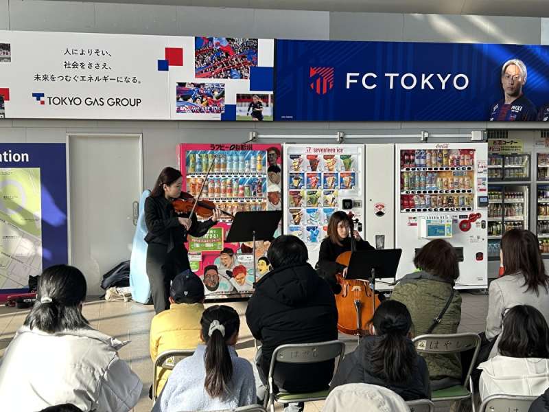 ヴァイオリンとチェロの二重奏の音色が飛田給駅に響き渡り、多くの人が足を止めて立ち寄ってくださいました。それくらい思わず聴き入ってしまう素敵な演奏でした。