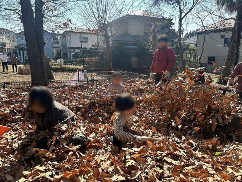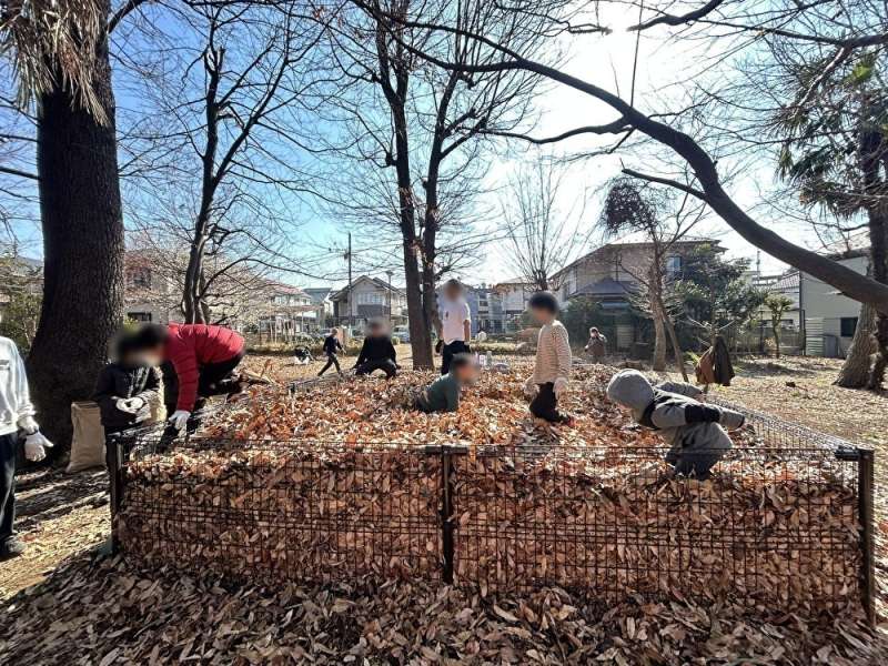 この日は、地域の大人の方々の他に、石原小学校の子どもたちもお手伝いに来てくれました。一生懸命落ち葉を拾い集めた後は、ふかふかの落ち葉だめの上にダイブして落ち葉を掛け合い大はしゃぎ!出てきたカブトムシの幼虫も、嬉しそうに持って帰っていました。