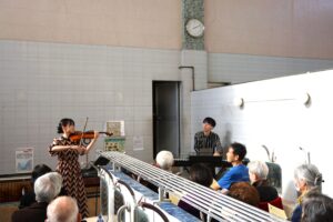 天井が高くタイル張りの広い大浴場では、ヴァイオリンやピアノの音色がしっかりと心地よく響きます。目をつぶると、まるでコンサートホールにいるかのよう。この日の演目は有名なクラシックの曲からタンゴ、童謡まで。それぞれの楽曲についてのトークもわかりやすく、軽やか。観客のみなさんはますますリラックス!1時間ほどのコンサートでしたが、幅広く、さまざまな曲を楽しむことができました。