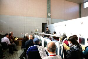 「梅の湯」に集まった観客は約60人。大浴場には電子ピアノと譜面台が置かれ、ずらりと椅子が並んでいます。更に、それだけでは入りきらないと、脱衣場や壁で隔てられた(天井部分は吹き抜けになっています)隣の浴場にも座席が用意されていました。
